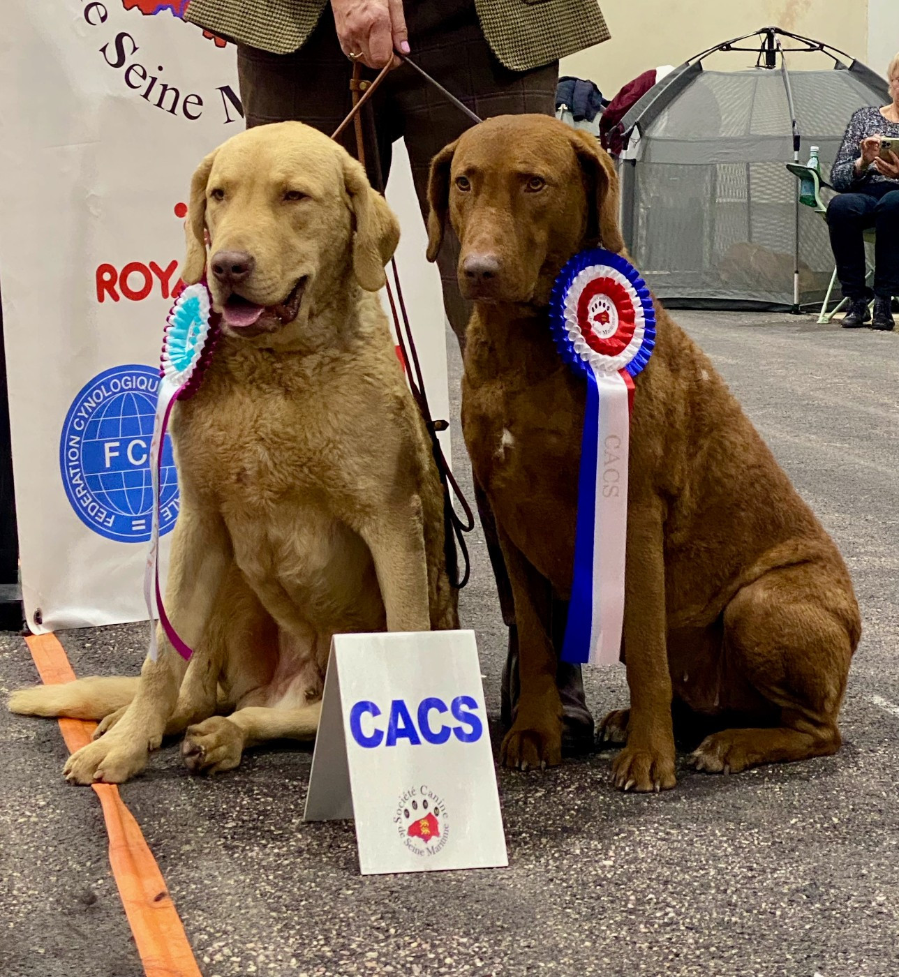 Dentition correcte. Excellente chienne avec des yeux correspondant à la couleur de la robe. Très belle encolure. Excellente ligne de dessus. Exc fouet et attache., exc poitrine, exc pieds. Exc mouvements , attention au fouet.