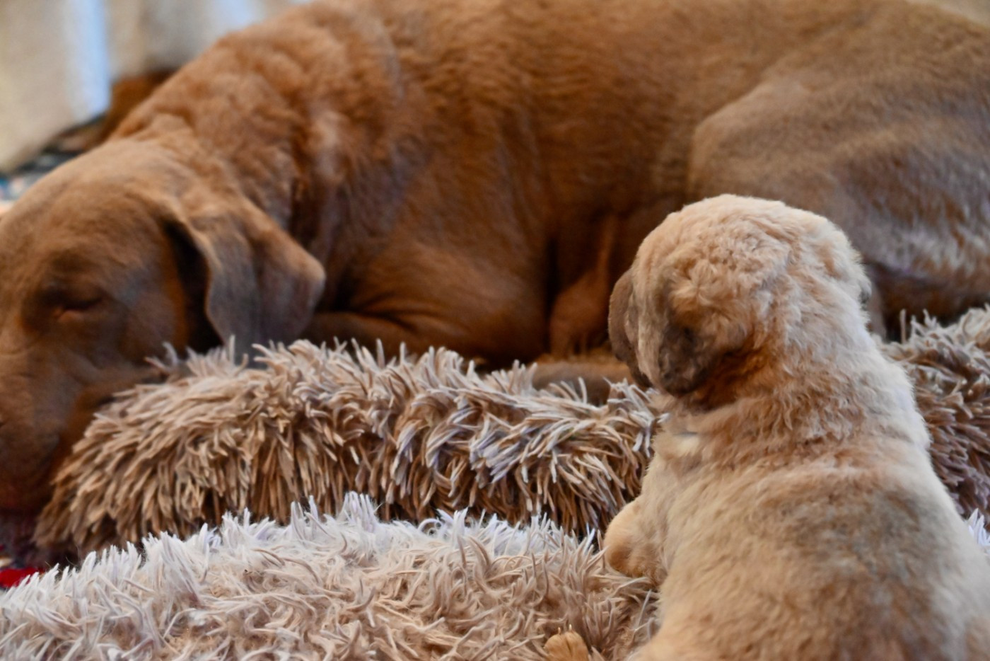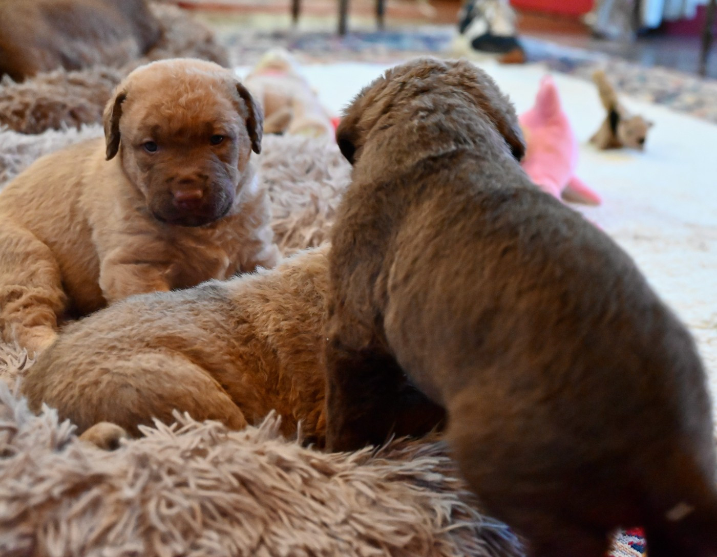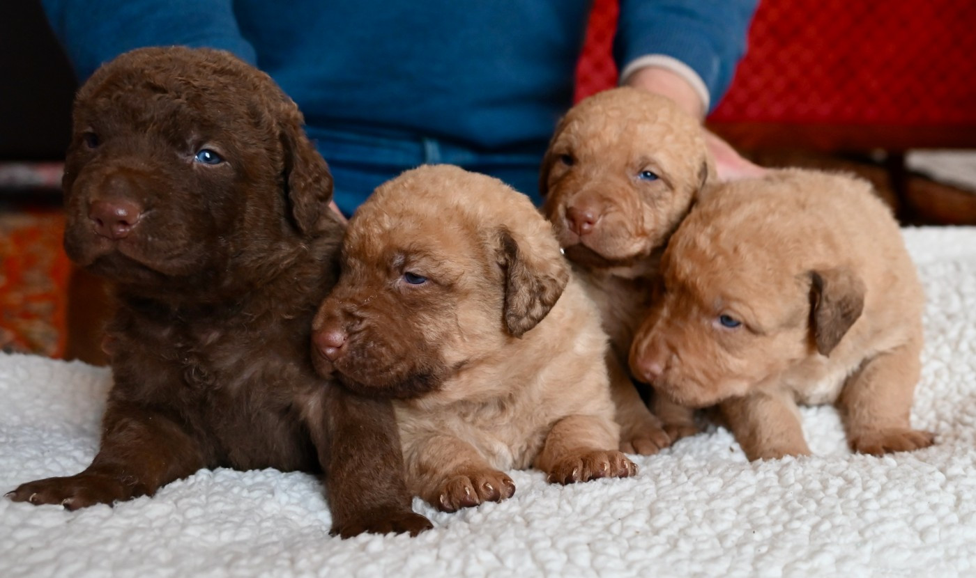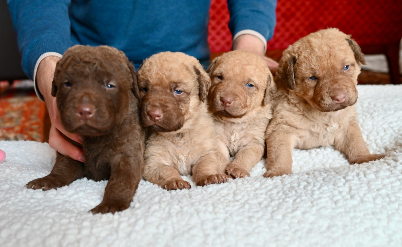 Portée GCHSilver Riversedge Jumpin Flash et MultiCH Rhéa of Potomac Les tous premiers jours .... Le petit mâle, à 5 jours et sa maman Rhéa Les premières pesées des bébés Deux des 3 petites femelles à 8 jours La bande des quatre oursons à 19 jours Portrait d'une petite femelle à 19 jours Une autre petite femelle, deadgrass plus soutenue en couleur Nous voilà !! tous les quatre à 19 jours On admire Maman Rhéa ! (photo à 21 jours) Jouer, c'est trop bien !!! (photo à 21 jours) La bande des quatre dans les jardins à 6 semaines (photo ©RichardLouvet)